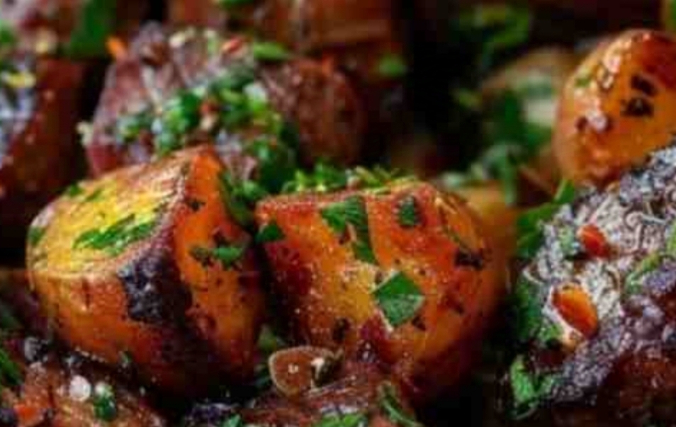 Ingredients:– 1 lb sirloin steak, cut into 1-inch cubes– 1 lb baby potatoes, quartered– 3 tablespoons olive oil, divided– 3 tablespoons butter, melted– 4 cloves garlic, minced– 1 tablespoon fresh parsley, chopped– Salt and pepper to taste– 1 teaspoon garlic powder– 1 teaspoon smoked paprika– Optional: fresh lemon wedges for garnishInstructions:1. **Prepare the Potatoes:**Preheat your air fryer to 400°F (200°C). Toss the quartered potatoes with 1 1/2 tablespoons of olive oil, garlic powder, smoked paprika, salt, and pepper. Place the seasoned potatoes in the air fryer basket and cook for 15 minutes, shaking the basket halfway through for even cooking.2. **Season the Steak:**While the potatoes are cooking, season the steak cubes with salt, pepper, and the remaining olive oil. Set aside.3. **Cook the Steak Bites:**Once the potatoes have cooked for 15 minutes, push them to one side of the air fryer basket. Add the steak bites to the other side and cook everything together for an additional 7-9 minutes, shaking the basket halfway through. Adjust cook time depending on your preferred doneness of the steak.4. **Prepare the Garlic Butter:**While the steak and potatoes are cooking, combine the melted butter, minced garlic, and chopped parsley in a small bowl.5. **Toss and Serve:**Once the steak bites and potatoes are done, remove them from the air fryer and toss with the garlic butter. Serve hot with optional lemon wedges on the side for a burst of freshness.**Prep Time:** 10 minutes | **Cooking Time:** 20 minutes | **Total Time:** 30 minutes**Kcal:** 550 kcal per serving | **Servings:** 4 servingsEnjoy!