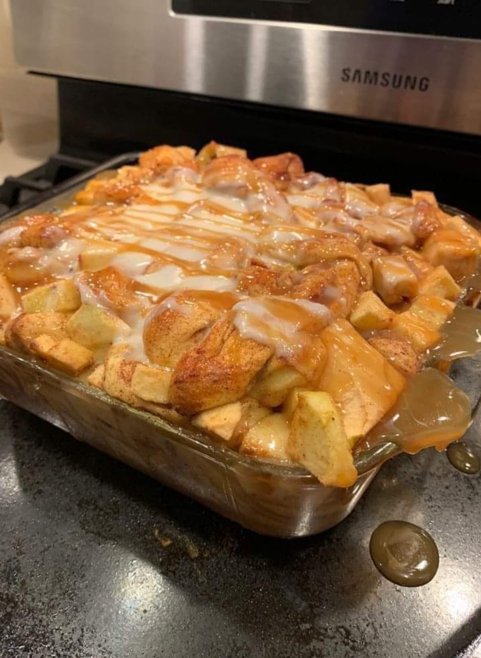 Ingredients2 packets of cinnamon rolls4 large apples, peeled and diced (Granny Smith or Golden Delicious)Half a cup of sugar1 teaspoon cinnamonHalf a teaspoon of nutmeg1 tablespoon of cornstarch1/2 cup caramel sauce (or salted caramel sauce if you prefer)PreparationPreheat oven to 375°F and spray an 8″ x 8″ x 2″ glass or ceramic dish with nonstick spray (I used a 7″ x 9″ x 2″ ceramic dish).In a bowl, mix apple cubes, sugar, cornstarch, cinnamon, and nutmeg to coat evenly.Cut the cinnamon rolls into 1/2-inch strips and roll them out on a floured work surface until fluffy. Sprinkle it with flour, as it is very sticky and will fall apart when rolled. You can dust your hands with flour and tap it to loosen it up if you find it easier.Arrange the first layer of flattened cinnamon rolls on the bottom and sides of the dish. Press them with your hands to seal them well.Spread 1/2 apple out of the filling and drizzle 2-3 tablespoons of caramel sauce on top. Cover with another layer of cinnamon rolls.Spread the remaining apples and pour again with caramel sauce. Cover with remaining flat cinnamon rolls.Cover with aluminum foil and bake for 30 minutes. Then remove the aluminum foil and bake for another 10-15 minutes until the top is golden brown.Leave to cool for at least 30 minutes, drizzle with icing (which comes with the cinnamon rolls) and serve.