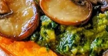 Stuffed Sweet Potatoes with Spinach, Mushroom, Feta & Rosemary Garnished with Fresh Basil Pesto