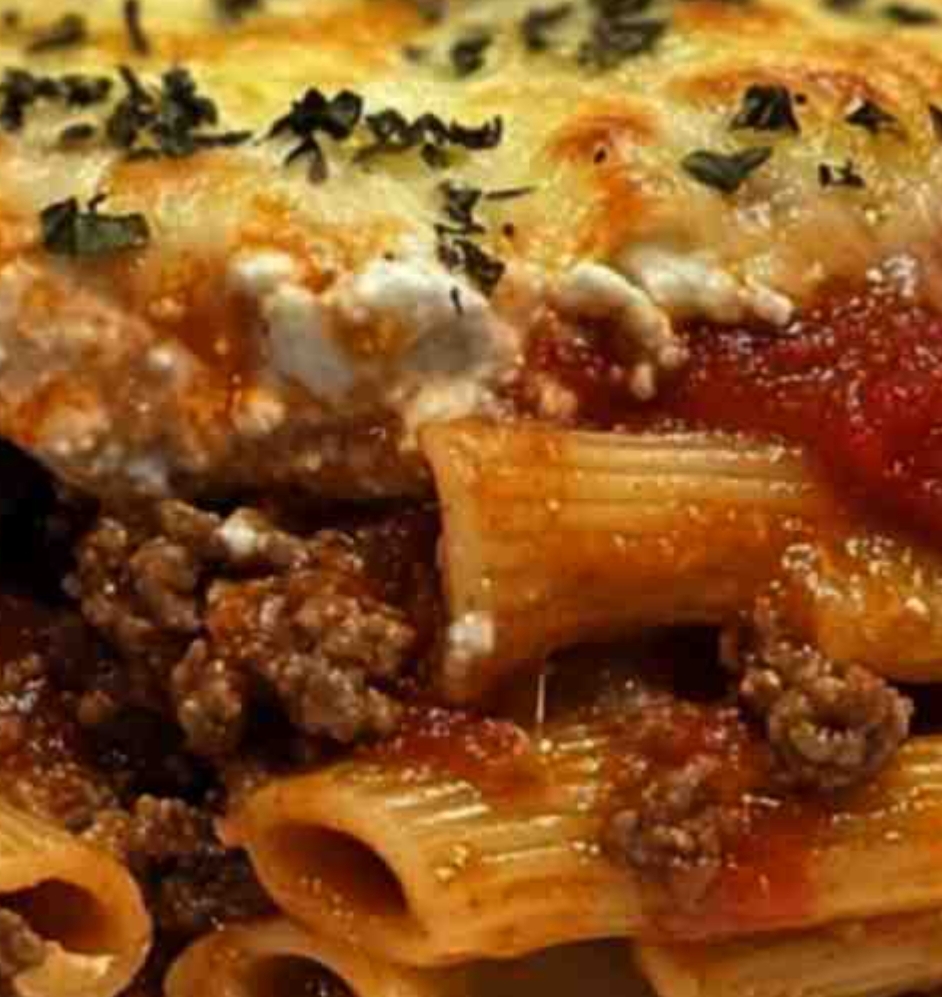 Ingredients:•1 pound ziti pasta•1 pound ground beef•2 cups marinara sauce•1 cup ricotta cheese•2 cups shredded mozzarella cheese•1/2 cup grated Parmesan cheese•2 cloves garlic, minced•1 teaspoon Italian seasoning•Salt and pepper to taste•Fresh parsley (optional, for garnish)Instructions:1.Cook the Pasta•Boil a large pot of salted water and cook the ziti pasta according to the package instructions until al dente.•Drain and set aside.2.Prepare the Meat Sauce•In a large skillet, brown the ground beef over medium heat.•Add the minced garlic and cook for 1-2 minutes until fragrant.•Stir in the marinara sauce, Italian seasoning, salt, and pepper. Simmer for 5-7 minutes.3.Preheat the Oven•Preheat your oven to 375°F (190°C).4.Assemble the Ziti•In a large mixing bowl, combine the cooked ziti pasta with half of the meat sauce.•Spread half of the ziti mixture into a greased 9×13-inch baking dish.•Dollop ricotta cheese evenly over the layer of ziti.•Add the remaining meat sauce on top, spreading it evenly.•Sprinkle shredded mozzarella and Parmesan cheese over the top.5.Bake•Cover the baking dish with aluminum foil and bake for 20 minutes.•Remove the foil and bake for an additional 10-15 minutes, or until the cheese is bubbly and golden.6.Serve•Let the baked ziti cool for 5 minutes. Garnish with fresh parsley, if desired, and serve warm.Enjoy this comforting and cheesy baked ziti dish! Perfect for family dinners or gatherings.Enjoy!