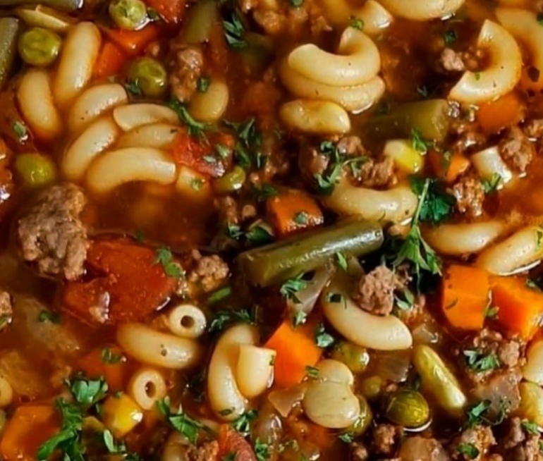 In a large saucepan heat the oil over medium heat. Add the onion and cook until tender and translucent about 5 minutes. Add the garlic and cook for another 1 minute. Add the ground beef and season with salt and pepper. Cook until no longer pink. Drain off excess fat if necessary. Stir in beef stock diced tomatoes tomato sauce sugar Worcestershire sauce basil oregano thyme and bay leaves. Bring to a boil reduce to a simmer and cook for 10 minutes. Stir in macaroni and continue to simmer until pasta is tender about 10 minutes longer. Adjust seasoning as needed