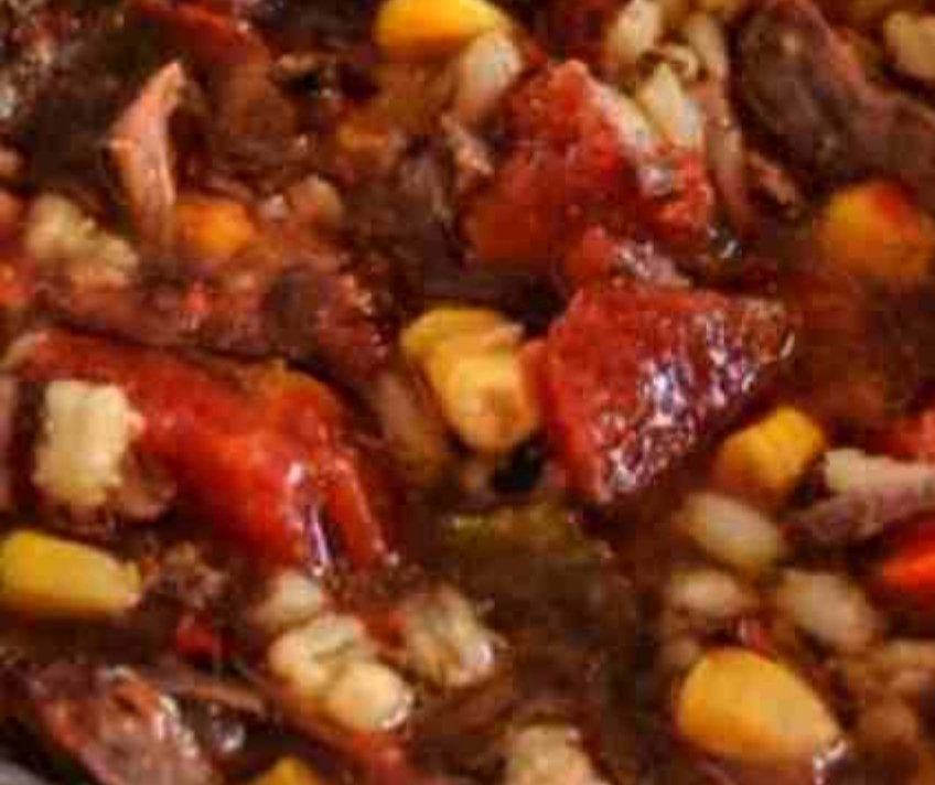 Add the beef broth, diced tomatoes, bay leaf and beef back to the pot. Reduce heat and simmer for 1 1/2 hours or until the roast is fork tender. Add barley and corn; cover with lid for 30 minutes. Remove lid and continue simmering for 15 minutes.