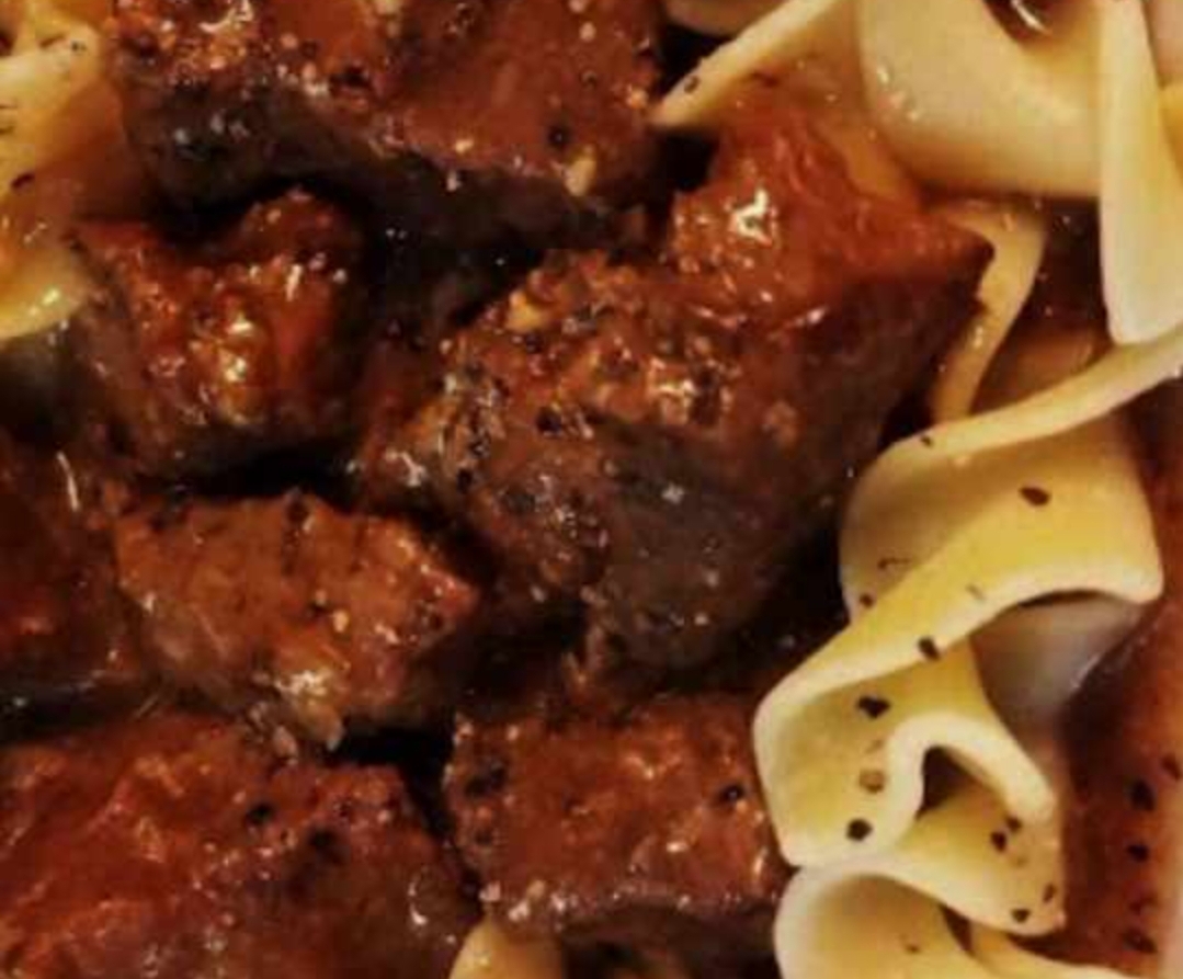 BEEF TIPS, EGG NOODLES AND CREAMY GRAVY