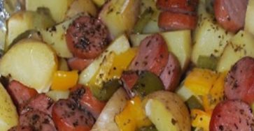 * Ingredients°1 box chimney sausage sliced from Eckrich.°8 golden yukon potatoes cut into quarters.°1 cube green pepper.°1 cube yellow pepper.°2…