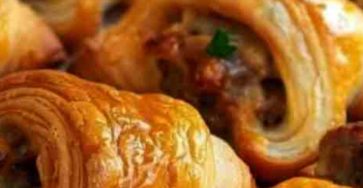 These look like Sausage-Stuffed Puff Pastries, a delicious and flaky appetizer! Here’s a recipe to replicate this savory treat:Sausage-Stuffed Puff…