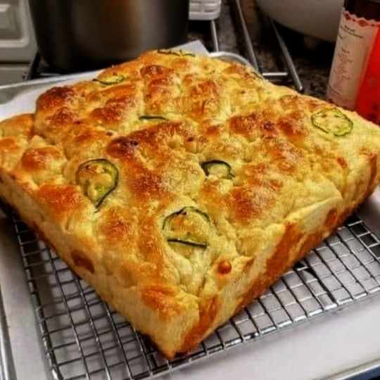 Cut the Jalapeño Cheddar Focaccia into slices and serve warm or room temperature.