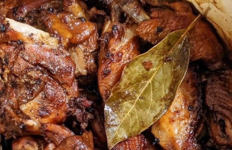 INGREDIENTS:3 bay leaves4 tsp whole black peppercorns1 tbsp neutral oil1.5 lbs bone-in/skin-on chicken thighs and 1.5lbs skin-on chicken wings/drumettes1/2 cup apple cider vinegar1/2 cup shoyu (soy sauce)1/2 cup lager beer1 tbsp brown sugar5 garlic cloves, peeled and smashedMETHOD:Place a dutch oven over med heat and toast the bay leaves and peppercorns until fragrant and the bay leaves have a nice sheen(3-4min).Remove spices and crush 3/4 of the peppercorns with a mortar and pestle.Pour the oil in the dutch oven and brown chicken in batches, skin side down, until golden brown and fat has rendered (6-8min).Wiggle chicken from time to time to make sure the skin doesn’t stick. Place all the chicken on a plate as you work the batches. Once done, pour out all but 1 tbsp of oil.Return the pot to the stovetop over low heat and pour in the vinegar, shoyu, beer, brown sugar, garlic, bay leaves, and peppercorns. Stir and cook for 2 minutes.Add the chicken and any juices and move heat to med-high, to bring to a low boil. Lower the heat to med-low, cover and cook for 45min, flipping the chicken halfway through.Remove the lid and simmer for 15min. Remove the chicken and place skin-side up on a baking sheet.Turn the heat to high and let the sauce reduce to half (5-6min)..