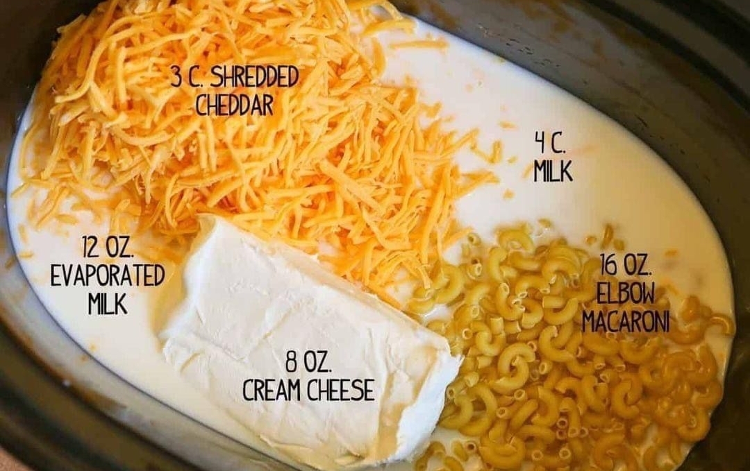 16 ounces uncooked elbow macaroni3 cups cheddar cheese shredded8 ounces block cream cheese2½ cups of whole milk12 ounces evaporated milkAdd all of the ingredients into your crockpot. Set on low and cook for up to 2½ hours or until it looks like mac ‘n’ cheese. Stit after two hours to check that the recipe is done.Step 2:The sauce may be thick and cheesy so you might want to add in some more cooked macaroni and milk to even it out. Then put the setting on “Keep Warm” until ready to serve.TipsYou can use cooked noodles just decrease the cooking time to 1½ – 2 hoursIf you desire more flavor in your mac n cheese you can add some mustard and garlic to this recipe and adjust to your taste.Pre-shredded cheese does not work well in this recipe. It contains an anti-caking agent that can make this recipe gritty. Better to get whole cheese and shred it yourself.Slow cookers can vary from one another While some may cook slow others may be faster. SO you may have to adjust the time for your slow cooker and set it to warm if your mac n cheese gets done earlier than expected.