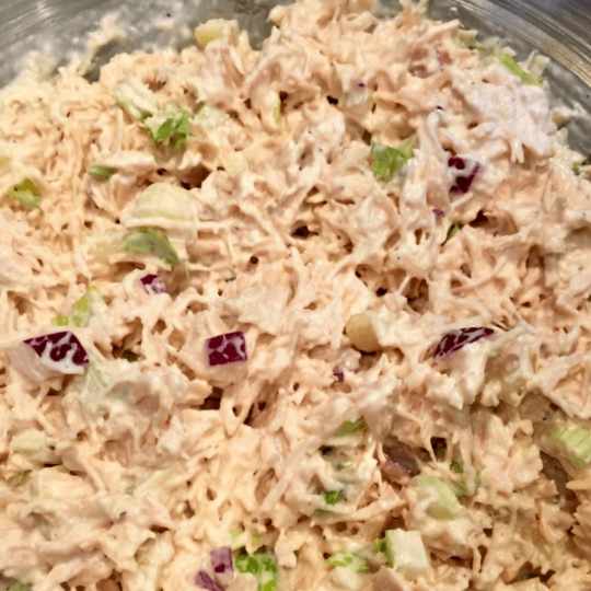 This recipe asks for mayonnaise or miracle whip, chopped cooked chicken (rotisserie chicken works wonderfully), grapes, and toasted walnuts. I like using Olive Oil Miracle Whip, which is “new” to me. Since I’ve just lately begun using it, I say “new to me.” Let’s go on to the recipe.