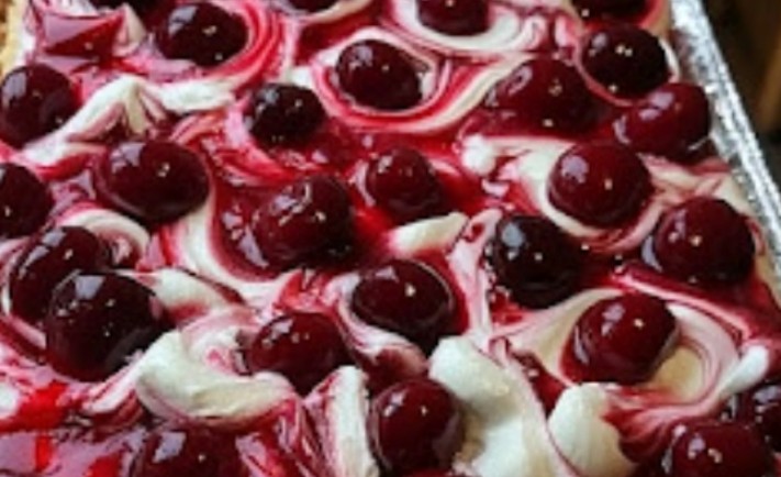Spread ⅔ of the cherry pie filling evenly over the cake layer.