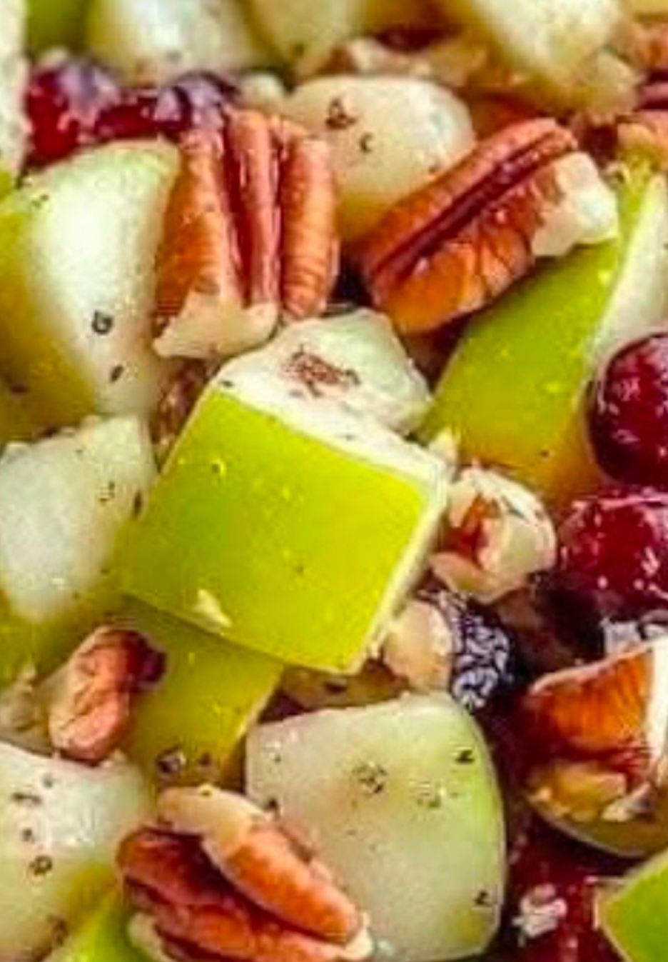 ingredients.2 chopped green applesone cup of cranberries that have been driedRoughly chopped pecans, measuring 1 cupIf desired, add 1 tablespoon of poppy seeds.1/2 cup of maple syrup or honey1/3 tablespoon of freshly squeezed lemon juiceFor a creamier texture, you may optionally add 1/4 cup of Greek yogurt or mayonnaise.The recipe calls for a big mixing basin, so get out your sliced green apples, dried cranberries, and chopped pecans.Combine the poppy seeds, lemon juice, honey (or maple syrup), and small bowl and whisk until well combined. Add Greek yogurt or mayonnaise for a creamier dressing if you want.Gently mix the salad items with the dressing after drizzling it over them.Either serve right away or let it cool for 15 to 20 minutes to bring out more flavor.Advice: For more color and taste, try adding fresh pomegranate seeds or orange slices.Add some grilled chicken or feta cheese for some extra protein.