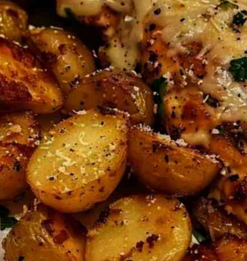 Ingredients:For the Chicken:4 boneless, skinless chicken breasts1/4 cup grated Parmesan cheese1/4 cup breadcrumbs (optional for extra crunch)2 tablespoons olive oil2 teaspoons garlic powder1 teaspoon dried thyme or Italian seasoningSalt and pepper to taste2 cloves garlic, mincedFresh parsley, chopped (for garnish)For the Potatoes:4-5 medium potatoes, cut into 1-inch cubes (Yukon Gold or red potatoes work well)2 tablespoons olive oil1 teaspoon garlic powder1 teaspoon dried rosemary or thymeSalt and pepper to taste1/4 cup grated Parmesan cheese1-2 tablespoons chopped fresh parsley (optional)Instructions:Prep the Chicken:Preheat your oven to 400°F (200°C).In a shallow bowl, mix the Parmesan cheese, breadcrumbs (if using), garlic powder, dried thyme, salt, and pepper.Dredge each chicken breast in the mixture, pressing down slightly to coat them evenly on all sides.Cook the Potatoes:In a large bowl, toss the cubed potatoes with olive oil, garlic powder, rosemary, salt, and pepper.Spread the potatoes evenly on a baking sheet lined with parchment paper or foil.Sear the Chicken:Heat 2 tablespoons of olive oil in a large oven-safe skillet (preferably cast iron) over medium-high heat.Once hot, add the chicken breasts and sear for about 2-3 minutes on each side until golden brown.Bake:Place the skillet with the chicken in the oven, along with the baking sheet with the potatoes.Bake both for about 20-25 minutes, or until the chicken reaches an internal temperature of 165°F (74°C) and the potatoes are tender and golden.Add Garlic Parmesan Topping:About 5 minutes before the dish is done, sprinkle the remaining grated Parmesan cheese over the potatoes and chicken.If you like a stronger garlic flavor, you can add minced garlic to the chicken breasts in the last 5 minutes of baking, letting it bake with the chicken.Serve:Once everything is cooked, remove from the oven and garnish with fresh chopped parsley.Serve the chicken alongside the garlic Parmesan potatoes, and enjoy!This dish combines crispy, cheesy chicken with flavorful roasted potatoes, making it a meal that will surely satisfy your taste buds.Enjoy!