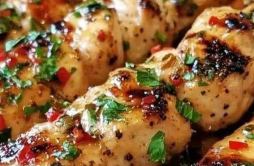 3. Thread the chicken pieces onto the skewers and brush them generously with the garlic Parmesan mixture, making sure each piece is coated.