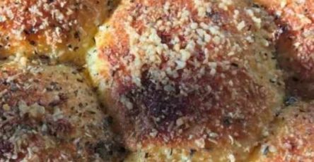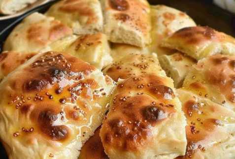 – Punch down the dough to release the air. Divide it into small balls (about the size of a golf ball) and place them in a greased round baking pan or skillet.