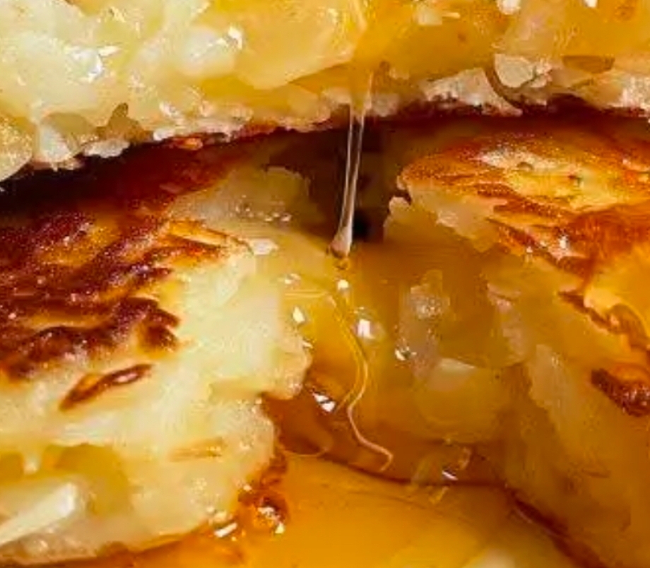 IngredientsServings: 4–64 large russet potatoes, peeled and grated1 small onion, finely chopped2 large eggs, beaten1/4 cup all-purpose flour1 tsp salt1/2 tsp black pepper1 cup shredded cheese (cheddar or your favorite cheese)2 tbsp butter2 tbsp honeyVegetable oil, for fryingInstructionsStep 1: Prepare the PotatoesGrate the potatoes and place them in a clean kitchen towel. Squeeze out as much liquid as possible to ensure crisp pancakes.Transfer the grated potatoes to a large mixing bowl.Step 2: Mix the BatterAdd the finely chopped onion, beaten eggs, flour, salt, and black pepper to the grated potatoes.Mix well until the ingredients are evenly combined.Step 3: Shape and Stuff the PancakesTake about 2 tablespoons of the potato mixture and flatten it into a small pancake in your hands.Add 1 tablespoon of shredded cheese to the center of the pancake.Cover with another tablespoon of potato mixture, sealing the cheese inside. Repeat with the remaining mixture.Step 4: Fry the PancakesHeat a generous amount of vegetable oil in a large skillet over medium heat.Carefully add the pancakes to the hot oil, cooking 3–4 at a time.Fry for 3–4 minutes per side, or until golden brown and crispy.Remove from the skillet and drain on paper towels to remove excess oil.Step 5: Make the Honey ButterIn a small saucepan, melt the butter over low heat.Stir in the honey and mix until well combined.Step 6: ServeDrizzle the warm honey butter over the fried pancakes.Serve hot and enjoy the perfect combination of crispy potatoes, gooey cheese, and sweet honey butter.Serving SuggestionsPair with a fresh green salad or steamed vegetables for a balanced meal.Serve alongside hearty soups like tomato basil or chicken noodle for a cozy dinner.Offer applesauce or sour cream on the side for dipping, catering to different tastes.Tips for Perfect Potato PancakesSqueeze Out the Liquid: Removing excess water from the potatoes is key to achieving crispy pancakes.Choose the Right Cheese: Use a cheese that melts well, such as mozzarella, cheddar, or Gouda, for the best texture.Control the Heat: Fry over medium heat to ensure the pancakes cook through without burning.Honey Butter Twist: Adjust the honey butter ratio to suit your taste—add a bit more honey for extra sweetness or butter for richness.Why You’ll Love This RecipeCrispy and Gooey: A perfect balance of crunchy potatoes and melted cheese.Sweet and Savory: Honey butter adds a delightful touch to the savory pancakes.Family-Friendly: Picky eaters will love the cheesy filling and optional dipping sauces.