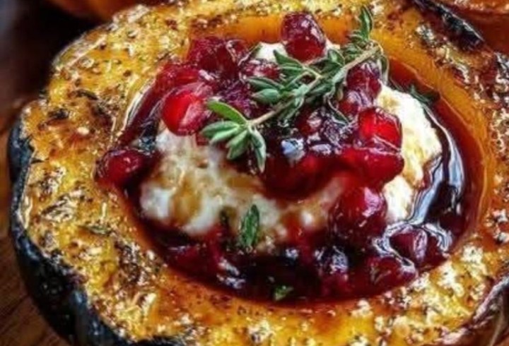 - Once cooled slightly, top each squash half with creamy goat cheese and a spoonful of cranberry sauce or compote.