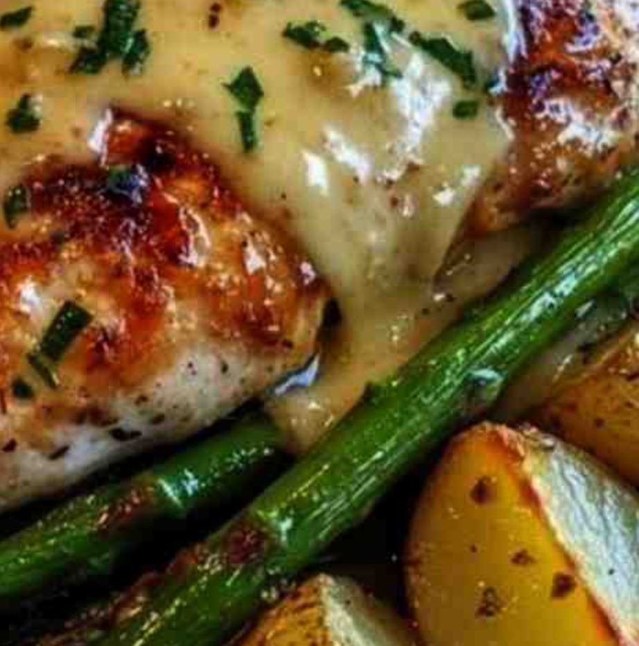 It’s paired with crispy roasted potatoes and tender asparagus, all smothered in a creamy Dijon sauce that’s both tangy and sweet. Perfect for an elegant dinner or a cozy weekend meal.