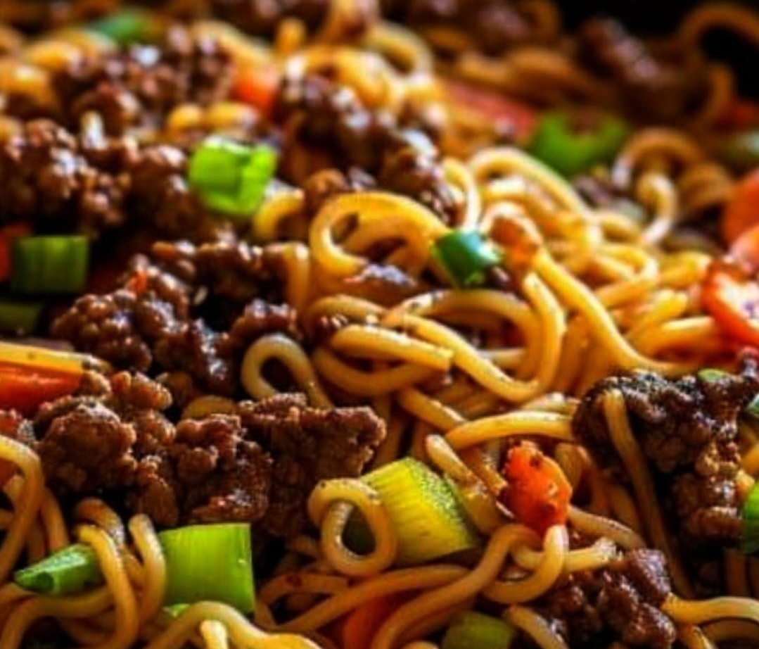 ongolian ground beef chow mein in a slow cooker, with 6 servingsThe recipe calls for 1.5 pounds of ground beef.– Three minced garlic cloves1/4 cup of soy sauce– hoisin sauce (two teaspoons) – sesame oil (one tablespoon)– One tablespoon of freshly grated ginger– A quarter teaspoon of black pepperIf you’re looking for a little heat, add 1/4 teaspoon of red pepper flakes.brown sugar, 1/4 cup– 1/2 cup of beef broth – 1 big onion, thinly sliced – 1 14 oz bag of coleslaw mix (dressing not included)eight ounces of chow mein noodles, prepared to package directions– Garnish with sliced green onions and sesame seeds