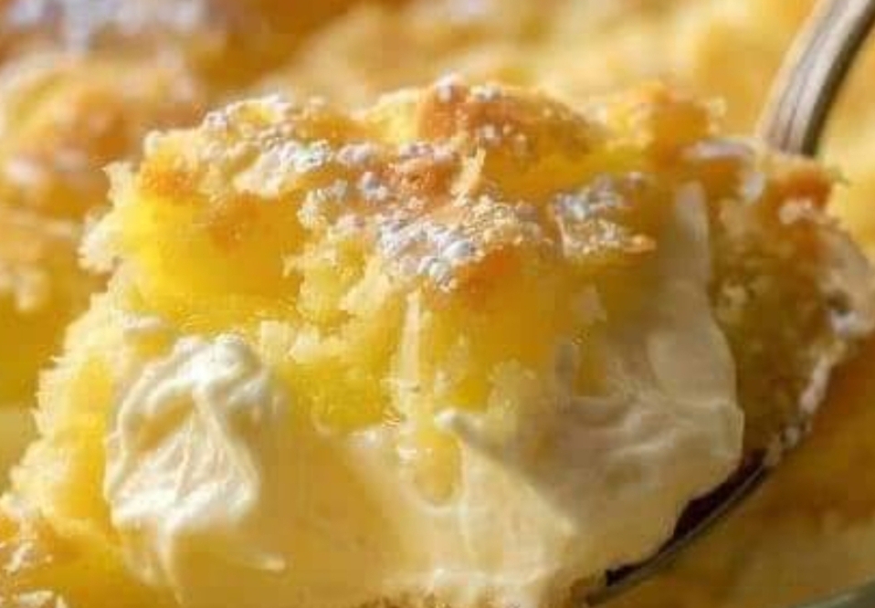 Ingredients:°1 box of yellow cake mix°1 package (21 ounces) lemon pie filling°1 pack (8 oz) soft cream cheese°1/2 cup (1 stick) melted unsalted butterPREPARATION:Preheat oven to 175°F and grease a 9″ x 13″ baking dish.In a large bowl, mix yellow cake mix and melted butter. Mix until crumbly.Spread half of the breadcrumb mixture evenly in the bottom of the prepared baking pan, pressing gently.In a separate bowl, whisk the lemon pie filling and the softened cream cheese until well combined and smooth.Spoon the lemon cream cheese mixture over the crumb layer in the baking dish, spreading evenly.Sprinkle the rest of the breadcrumb mixture on top until a crumbly layer forms.Bake in preheated oven for 40 to 45 minutes or until golden brown and cake is set in center.Remove from the oven and let it cool for a few minutes before serving.Cut into squares and serve warm or at room temperature. Optionally, you can sprinkle with powdered sugar or a little whipped cream.Enjoy !