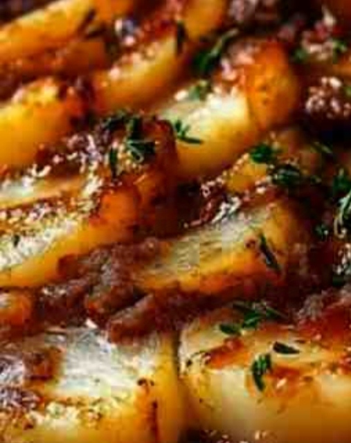 Prior to layering the potatoes and ground beef mixture, prepare the oven and butter a baking dish. Top layer seasoning.