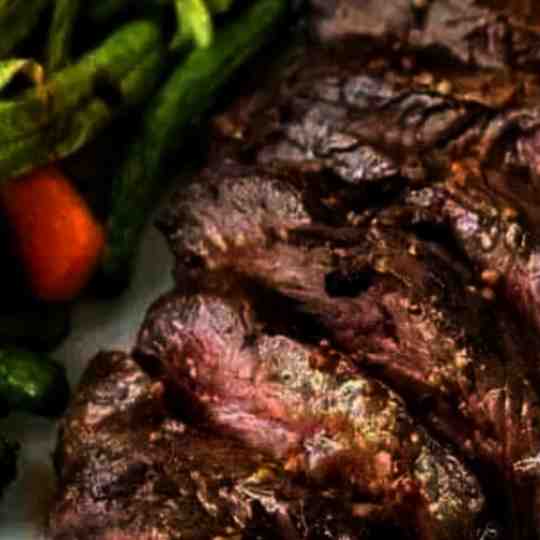 minutes, or until the vegetables are tender and slightly caramelized, stirring halfway through.Cook the Steak:Remove the steak from the marinade and let it come to room temperature while you preheat your grill or a large skillet over medium-high heat.Grill or sear the steak for about 4-5 minutes per side, or until it reaches your desired level of doneness. For medium-rare, aim for an internal temperature of 135°F (57°C).Transfer the steak to a cutting board and let it rest for 5-10 minutes before slicing against the grain.Serve:Slice the steak into thin strips and serve with the roasted vegetables. Garnish with fresh parsley if desired.