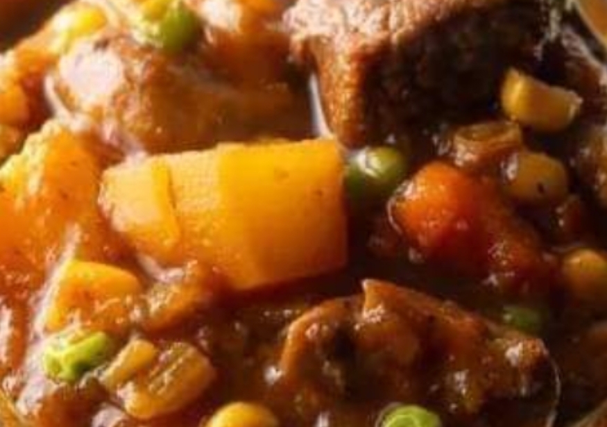 • Instructions:Instructions:In a large pot, brown the stewing beef over medium heat. Add diced onions and minced garlic, cooking until the onions are softened.Add sliced carrots, diced potatoes, chopped green beans, diced tomatoes, and beef broth to the pot. Stir in dried thyme, dried rosemary, salt, and pepper. Bring the stew to a simmer.Let the stew simmer for about 30-40 minutes or until the meat is tender and the vegetables are cooked through.Add corn kernels, peas, and shredded cabbage to the pot. Cook for an additional 10-15 minutes.Adjust the seasoning to taste and serve the stew hot, garnished with fresh parsley.Nutritional Information (Approximate Values Per Serving – Recipe Makes about 6 Servings):Calories: Around 300-350 kcalTotal Fat: 10-12gSaturated Fat: 4gMonounsaturated Fat: 4gPolyunsaturated Fat: 1gSodium: 800-1000mgTotal Carbohydrates: 30-35gDietary Fiber: 6-8gSugars: 6-8gProtein: 25-30g
