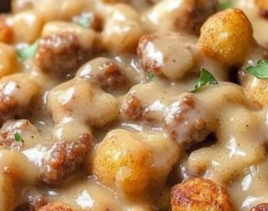 Ingredients:Ingredient QuantityFrozen tater tots 4 cupsBreakfast sausage 1 poundLarge eggs 4Shredded cheddar cheese 1/2 cupChopped green onions 1/2 cupAll-purpose flour 1/4 cupMilk 2 cupsSalt and pepper To tasteButter 1 tablespoonThese simple ingredients come together to create a flavor-packed meal that’s both satisfying and hearty.Step-by-Step Instructions to Prepare the Tater Tot Sausage Breakfast Bowl1. Prepare the Tater TotsStart by preheating your oven to 425°F (220°C). Spread the tater tots out evenly on a baking sheet in a single layer to ensure they become perfectly crispy. Bake the tater tots according to the package instructions, typically for around 20-25 minutes, or until golden brown. Be sure to flip them halfway through baking to achieve even crispness on all sides.For an extra crispy finish, consider placing the tater tots under the broiler for an additional 2-3 minutes, watching them closely to prevent burning.2. Cook the Breakfast SausageWhile the tater tots are baking, it’s time to cook the sausage. Heat a large skillet over medium heat and add the breakfast sausage. Use a spatula to break up the sausage into small crumbles as it cooks. Stir occasionally and cook for about 8-10 minutes or until the sausage is fully browned and no longer pink in the center.Once cooked, transfer the sausage to a plate lined with paper towels to drain off any excess grease. This step ensures the dish doesn’t become too oily, leaving room for the gravy to shine.3. Make the GravyUsing the same skillet (after draining any remaining sausage grease), melt the butter over medium heat. Once the butter has fully melted, add the all-purpose flour and whisk continuously for about 2 minutes. This creates a roux, which serves as the base for the creamy gravy.Gradually pour in the 2 cups of milk, continuing to whisk to prevent lumps from forming. Bring the mixture to a gentle simmer and cook for about 5 minutes, or until the gravy thickens to your desired consistency. Season with salt and pepper to taste.If you want to elevate the flavor even more, consider adding a dash of ground cayenne pepper or a pinch of garlic powder to the gravy for a subtle kick.4. Scramble the EggsIn a separate pan, heat a small amount of butter or oil over medium heat. Crack the eggs into a bowl, season with salt and pepper, and whisk them together. Pour the eggs into the pan and cook, stirring gently, until they are just set. This should take about 3-4 minutes.Be careful not to overcook the eggs—they should be soft and fluffy to complement the other textures in the bowl.5. Assemble the Breakfast BowlsNow comes the fun part—assembling the bowls! Divide the crispy tater tots evenly between four serving bowls. Top each with a portion of the cooked sausage, followed by the scrambled eggs. Sprinkle the shredded cheddar cheese on top of each bowl while the ingredients are still warm, allowing the cheese to melt slightly.Finally, pour the warm gravy generously over each bowl and garnish with chopped green onions for a pop of color and flavor.Enjoy!