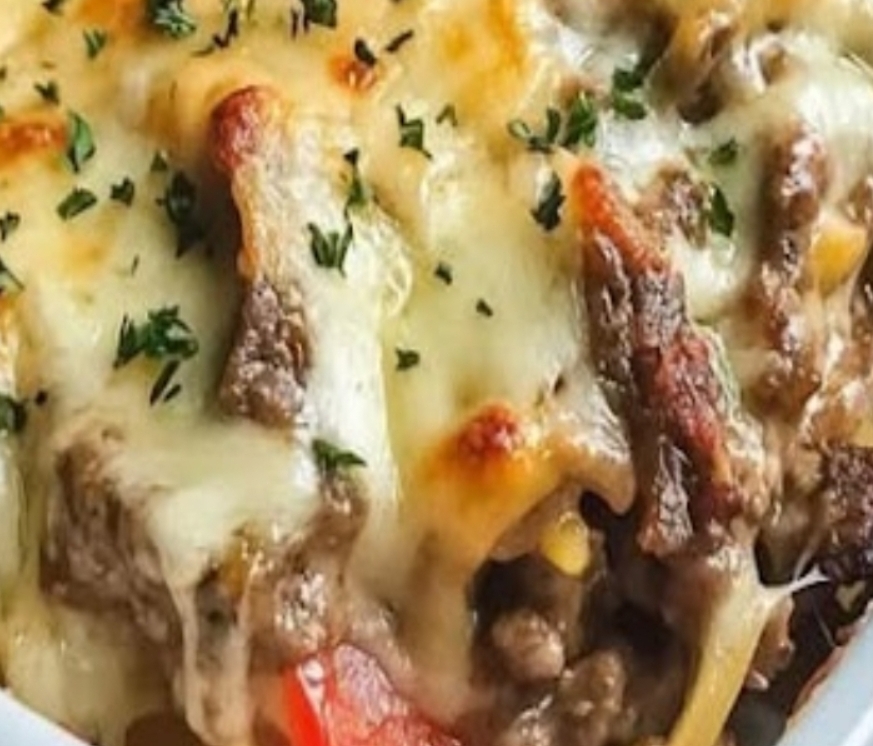 Bake the Philly Cheesesteak Casserole at 350 degrees f for 10-15 minutes or until the cheese melts.
