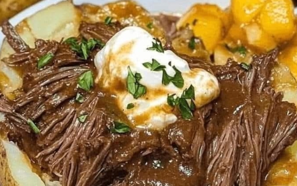 Ingredients:POT ROAST3-4 pounds chuck roast, smaller if possible2 tablespoons olive oil1 tablespoon butter1 tablespoon sea salt2 teaspoons pepperPOTATOES:6 large potatoes, for baking1 tablespoon canola oil2 teaspoons kosher saltGRAVY2 tablespoons cornstarch½ teaspoon kosher salt1 cup beef brothFILLING4 ounces cream cheese, room temperature4 ounces sour cream, room temperature2 tablespoons salted butter, melted½ teaspoon saltparsley, for garnishInstructions:ROASTTake the roast out of the refrigerator at least 30 minutes before cooking and generously salt and pepper it.Preheat oven to 300°FHeat a large Dutch oven over medium-high heat. Then add olive oil.Add butter to the pot. Once melted, place the roast in the pan and sear it for about a minute on both sides until it is brown all over.Cover and transfer roast to oven. Cook about 3 hours. You want the meat to be cooked through and to tear easily with a fork. CHECK TIME BASED ON ROAST SIZE.Remove the roast and set on a plate (tented to keep warm)HOMEMADE GRAVYIn a medium bowl, mix together the beef broth and cornstarch. Pour the mixture in the pan juices and simmer, stirring occasionally. The liquid will thicken after a few minutes. Add salt.Reserve ½ cup of gravy and set aside.Add the roast back to the pan and shred into the gravy. Set Aside.POTATOESIncrease oven heat to 350° F.Using a fork, prick the potatoes a few times on each side to create a heat vent.Coat each potato with canola oil and salt and bake for 1 hour. Potatoes should be fork-tender when done.Using a sharp knife, slice the top off (horizontally) of each potato.Using a spoon, remove the center of the potato and place into a large mixing bowl. Be very carefulnot to tear the potato skin. Lay the hollowed-out potato shells on a baking sheet.To the bowl of potatoes, add the reserved gravy, cream cheese, sour cream, butter, and salt and mash together until creamy.Fill the hollowed-out potato skins with the filling, and create a well in the filling.Fill and top with shredded pot roast and gravy.Bake for 15 to 20 minutes or until the potato is warmed through.Enjoy!