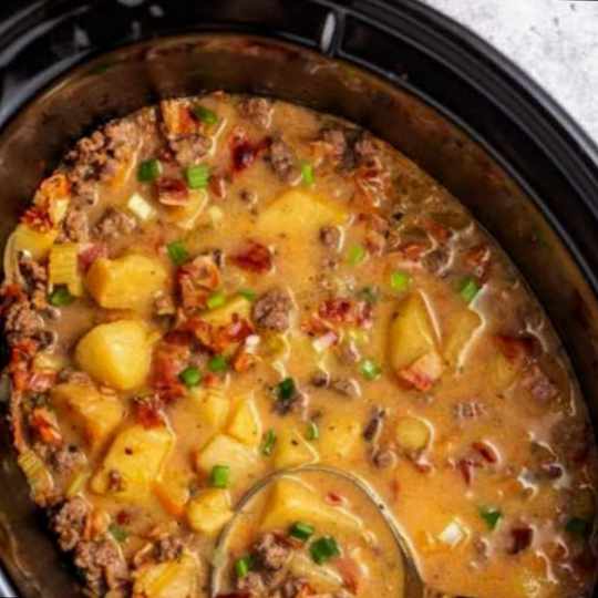 About 30 minutes before serving, brown the minced meat. Drain off the fat and add it to the slow cooker. Fry and chop the bacon, and transfer the chopped bacon to the slow cooker. You can also bake the bacon in the oven at any time while the soup is cooking and set it aside for later