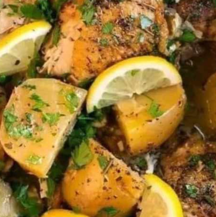 Ingredients:– 4 bone-in, skin-on chicken thighs– 1 pound baby potatoes, halved– 1 lemon, sliced– 4 cloves garlic, minced– 1/4 cup olive oil– 1 teaspoon dried thyme– 1 teaspoon dried rosemary– 1 teaspoon dried oregano– 1/2 teaspoon paprika– Salt and pepper to taste– Fresh parsley, chopped (for garnish)Instructions:1. **Marinate the Chicken:**– In a large bowl, mix olive oil, garlic, thyme, rosemary, oregano, paprika, salt, and pepper.– Add the chicken thighs and coat them well with the marinade.– Cover the bowl and let it marinate in the refrigerator for at least 1 hour, or overnight for best results.2. **Prepare the Potatoes:**– Preheat your oven to 400°F (200°C).– Place the halved potatoes in a large baking dish or roasting pan.– Drizzle with a little olive oil and season with salt and pepper.– Toss to coat the potatoes evenly.3. **Assemble and Bake:**– Arrange the marinated chicken thighs on top of the potatoes.– Place lemon slices around the chicken and potatoes.– Bake in the preheated oven for 35-40 minutes or until the chicken is fully cooked and the potatoes are tender.4. **Garnish and Serve:**– Remove the dish from the oven and let it rest for a few minutes.– Garnish with freshly chopped parsley before serving.Enjoy your flavorful and aromatic lemon herb chicken with potatoes!Enjoy!