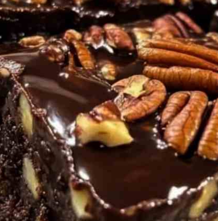 – Remove the brownies from the oven and pour the pecan pie mixture evenly over the top.