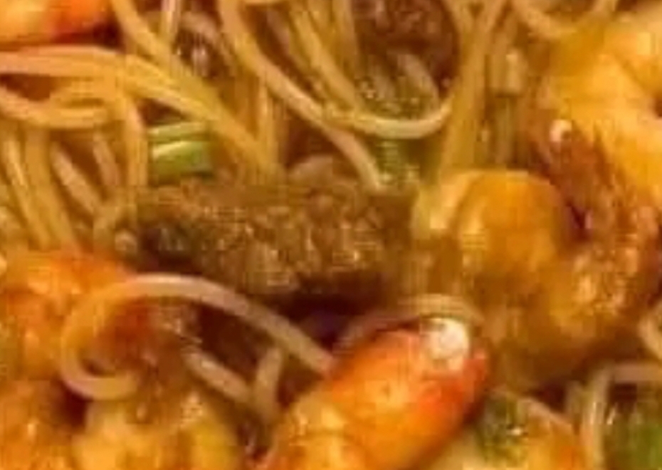 7. Return steak and shrimp to pan. Add cooked noodles and teriyaki sauce.