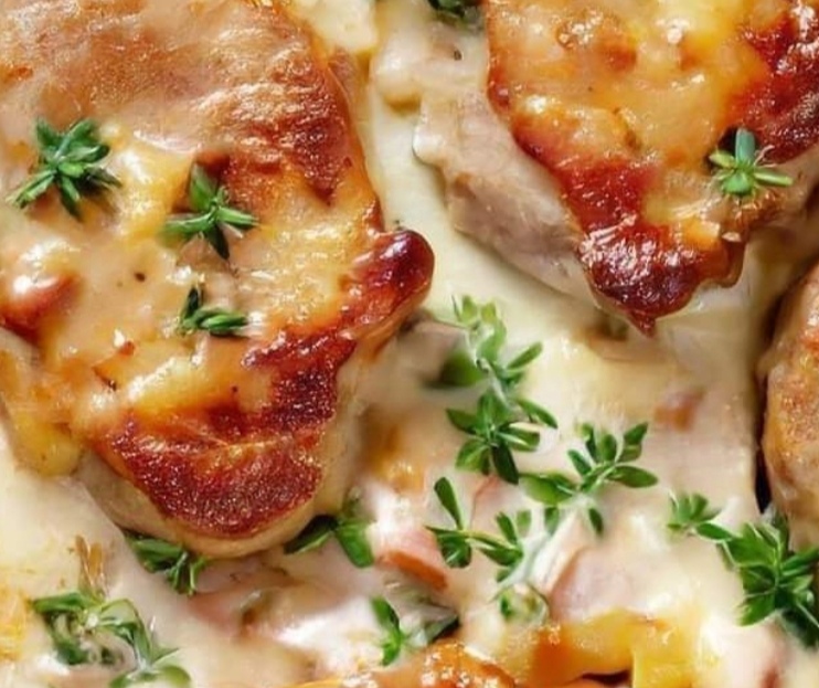 On top of the potatoes, seared pork chops are placed. These chops are typically seasoned with a mix of spices like paprika, onion powder, and a hint of cayenne for a bit of heat. The pork chops are seared until they develop a golden-brown crust, locking in their juices and flavor. Once the pork chops are arranged over the potatoes, they are smothered in a rich, creamy sauce.