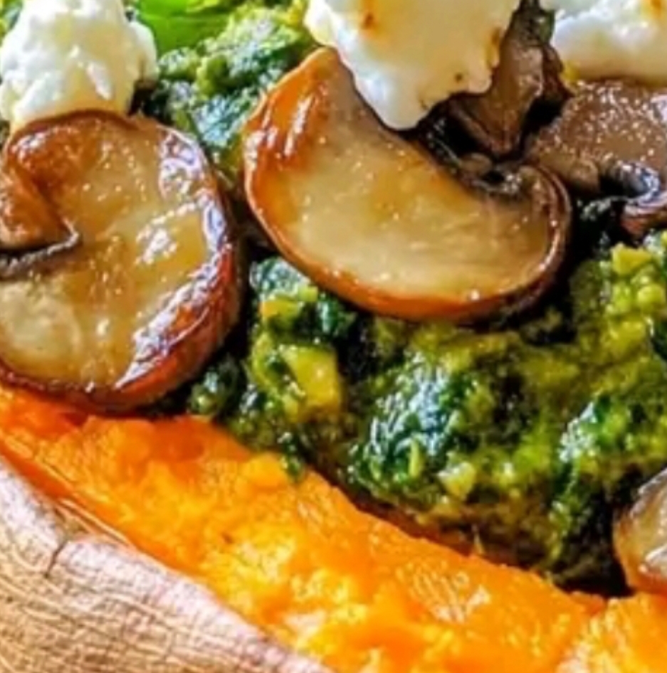 These Stuffed Sweet Potatoes are a symphony of flavors and textures—creamy roasted sweet potatoes, savory sautéed mushrooms and spinach, tangy feta, and fragrant rosemary, all topped with a vibrant fresh basil pesto. Perfect as a hearty vegetarian main or an impressive side dish, this recipe balances nutrition, ease, and gourmet appeal. The natural sweetness of the potatoes contrasts beautifully with the umami-rich filling, while the pesto adds a bright, herbaceous finish.
