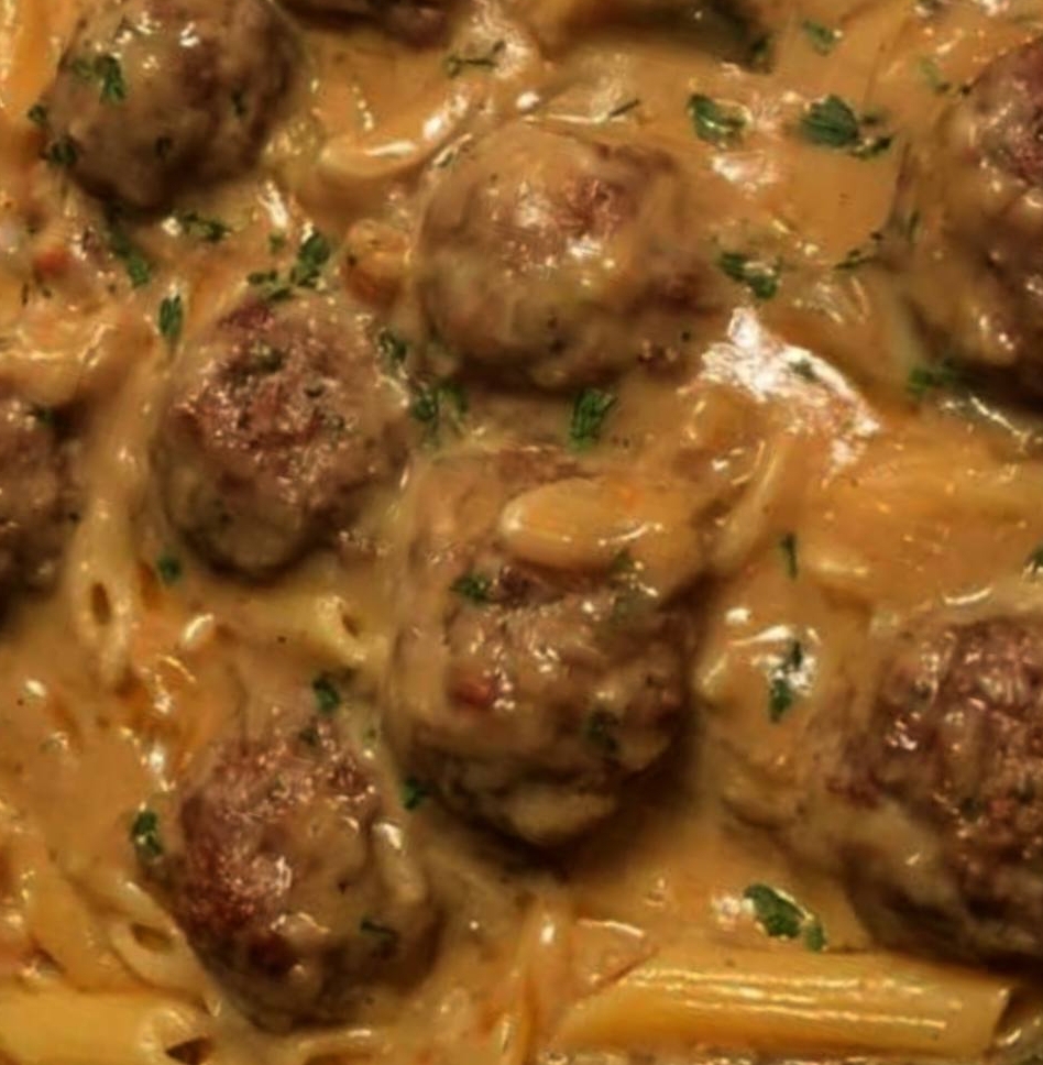 Assemble the Casserole: Spread the cooked noodles evenly in the prepared baking dish. Nestle the meatballs among the noodles. Pour the sauce evenly over the dish. Sprinkle grated Swiss cheese over the top.